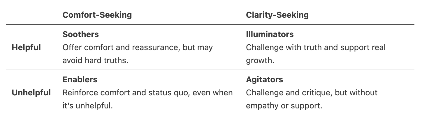 The key is to strike a balance between seeking clarity and seeking comfort. We need to be willing to challenge ourselves and others, but also to do so with empathy and understanding. Otherwise, we risk becoming either "agitators" who challenge without supporting, or "soothers" who comfort without confronting.11