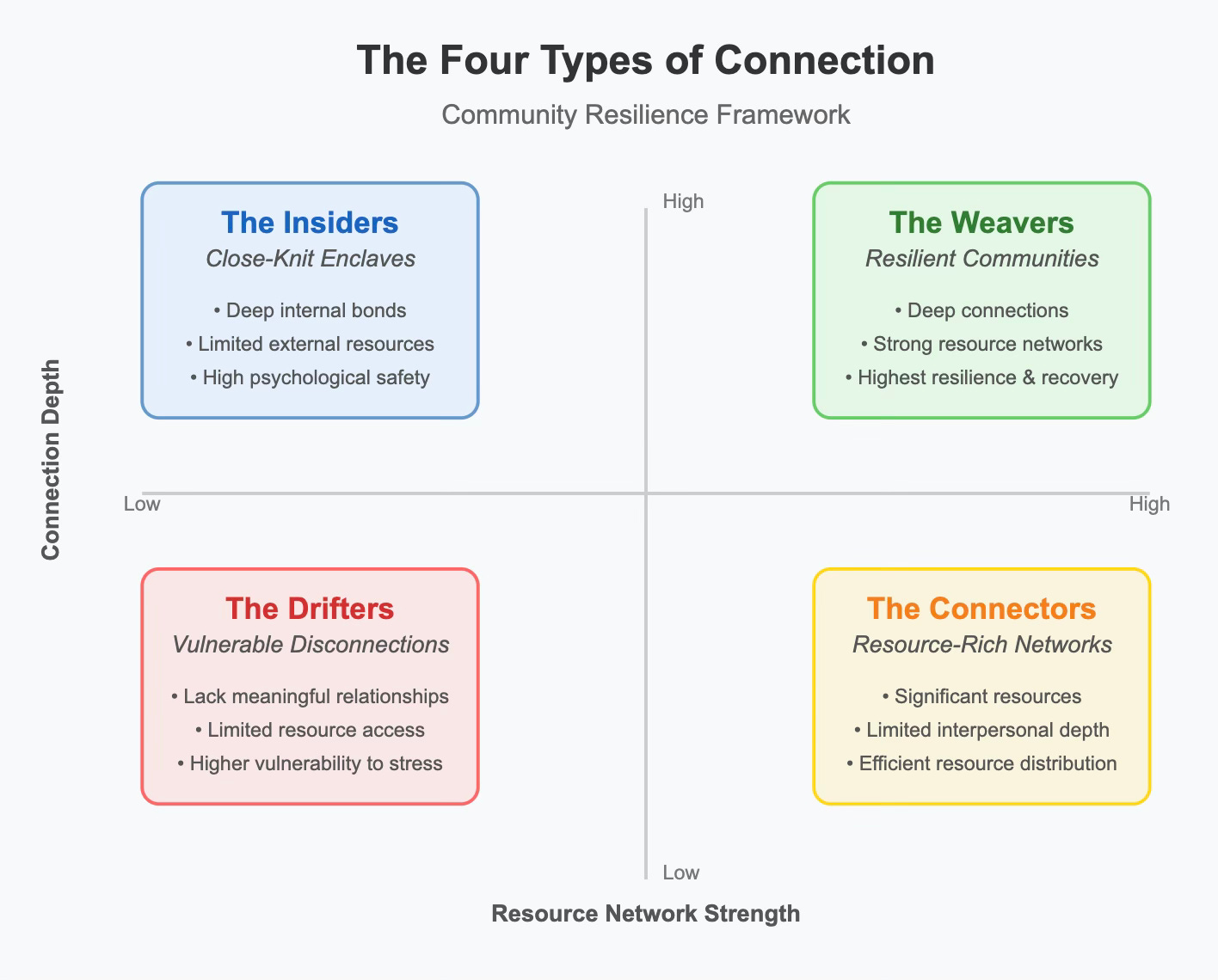 The Weavers: These are Resilient Communities that combine deep connections with strong resource networks. They experience the highest cognitive enhancement benefits and best crisis recovery. Think of neighborhoods with strong community centers where people both know each other’s names and coordinate resource sharing during emergencies.