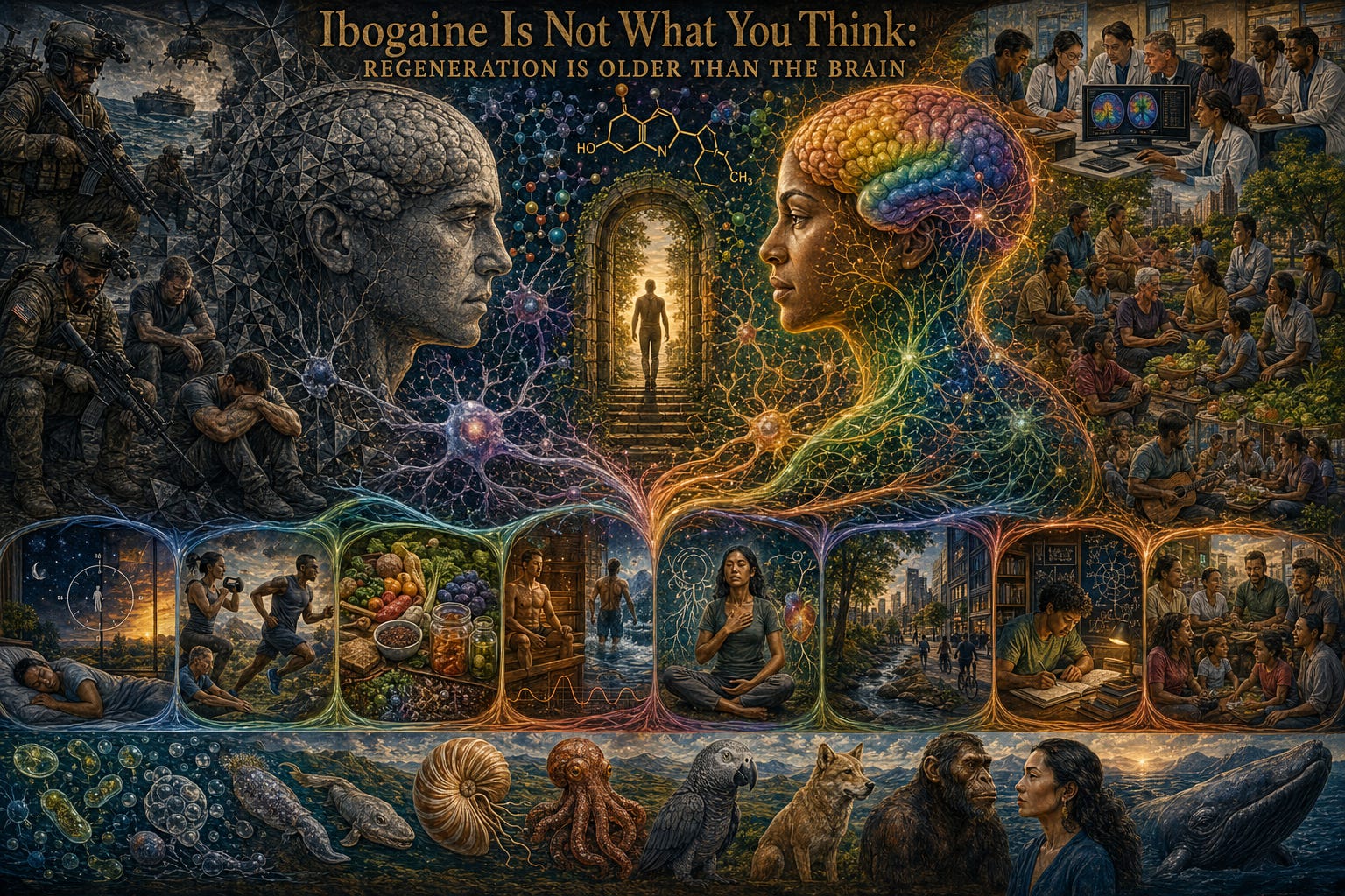 Ibogaine — an indole alkaloid that sits adjacent to this tryptamine receptor lineage and engages it more peripherally than psilocybin or LSD — is part of the same evolutionary picture. The cortical thickening and brain-age reduction the Stanford team measured are what this very old reorganizing capacity, fully engaged, looks like in the modern substrate, in a damaged mind needing to regenerate in order to become whole again.
