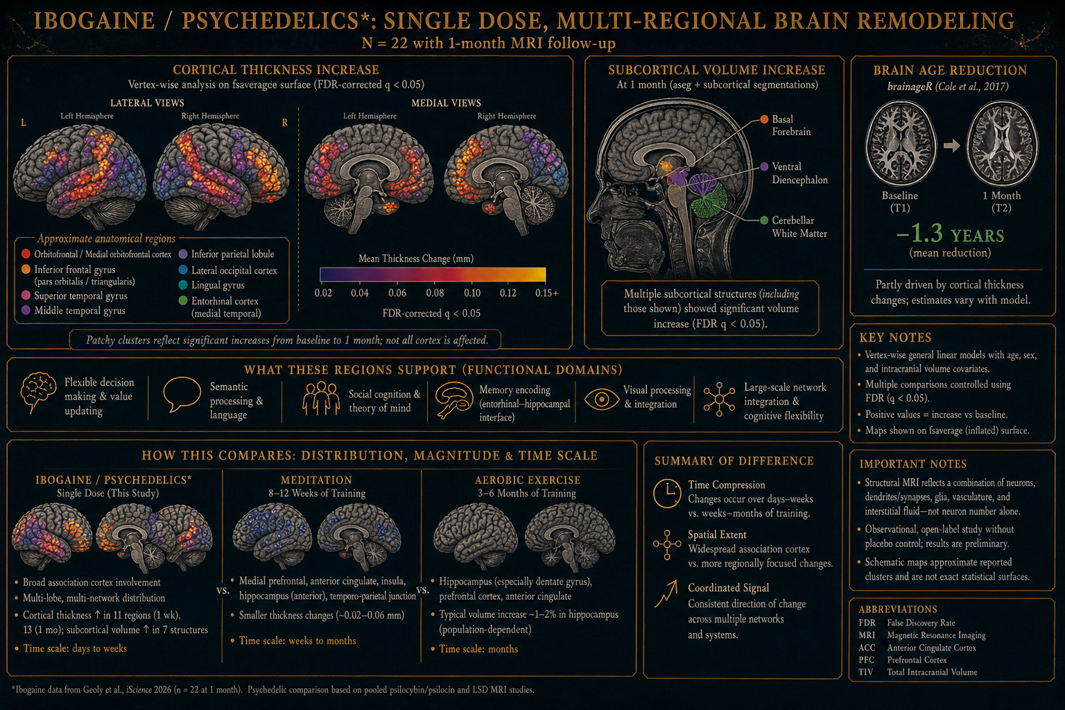 This year, the structural follow-up appeared. Same cohort, same protocol — but this time the brains themselves were measured, in detail, before and after. The paper, in iScience, describes something even more striking than the clinical findings.2 Cortical thickness rose in eleven regions one week after the dose, and in thirteen regions a month out. Subcortical volume expanded in seven anatomical structures, including cerebellar white matter, basal forebrain, and ventral diencephalon. And by the standard machine-learning metric of biological brain age3 — trained on tens of thousands of structural MRIs — the average brain in the cohort had become 1.3 years younger at one month, relative to where it started.