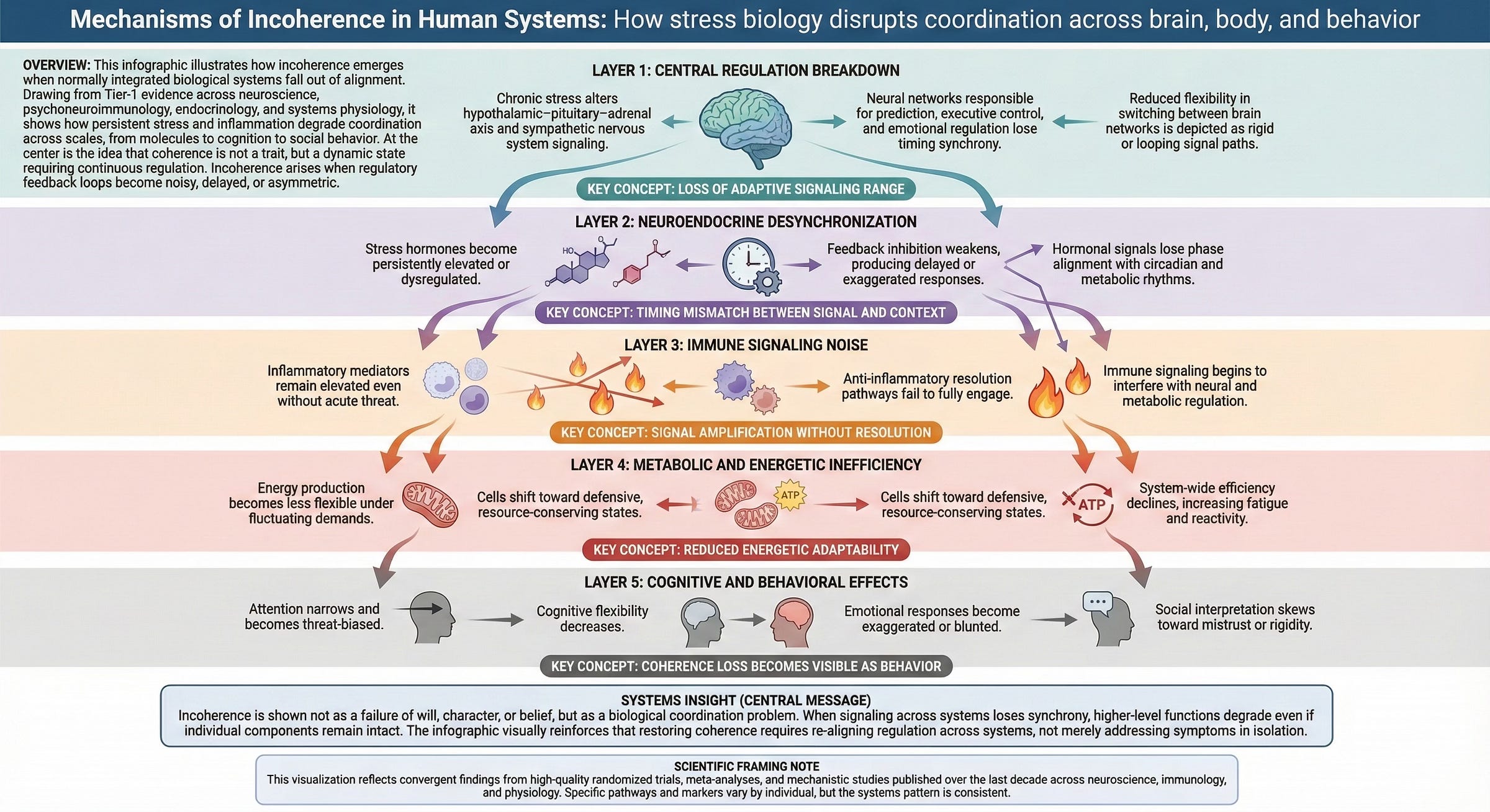 Biological incoherence: Inflammation rises, energy shifts toward vigilance, and repair slows.